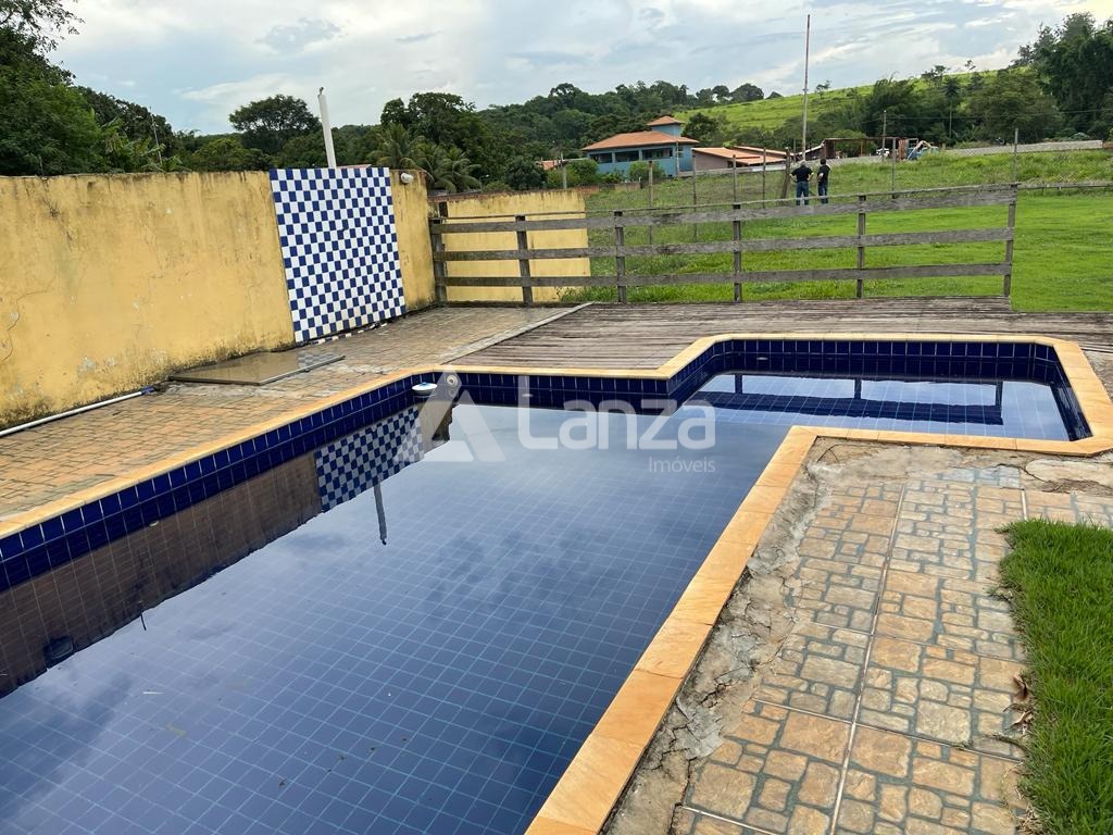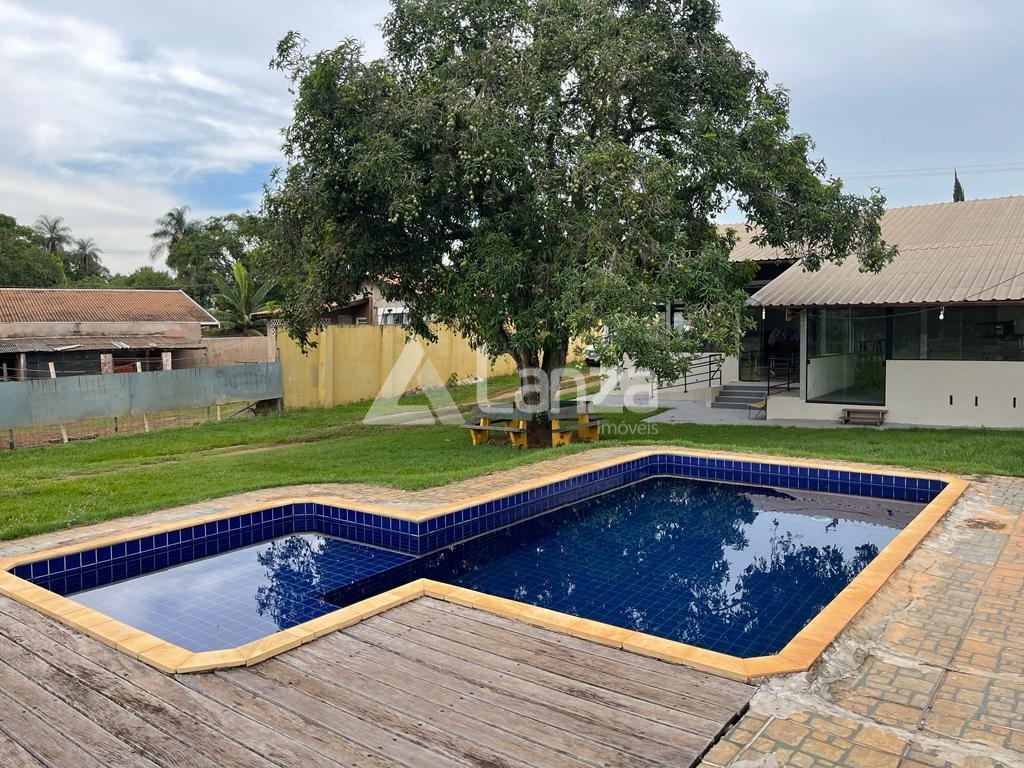 Área externa com piscina e gramado para um campo de futebol..
